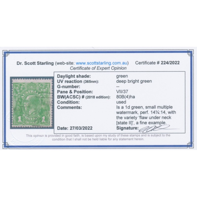 1926 1d green KGV Head, small multiple watermark, perf. 14¼:14, with the variety ‘flaw under King’s neck [first retouch = state II]’ [position = VII/37], used – no thins, tears or bends. Has a Starling certificate.