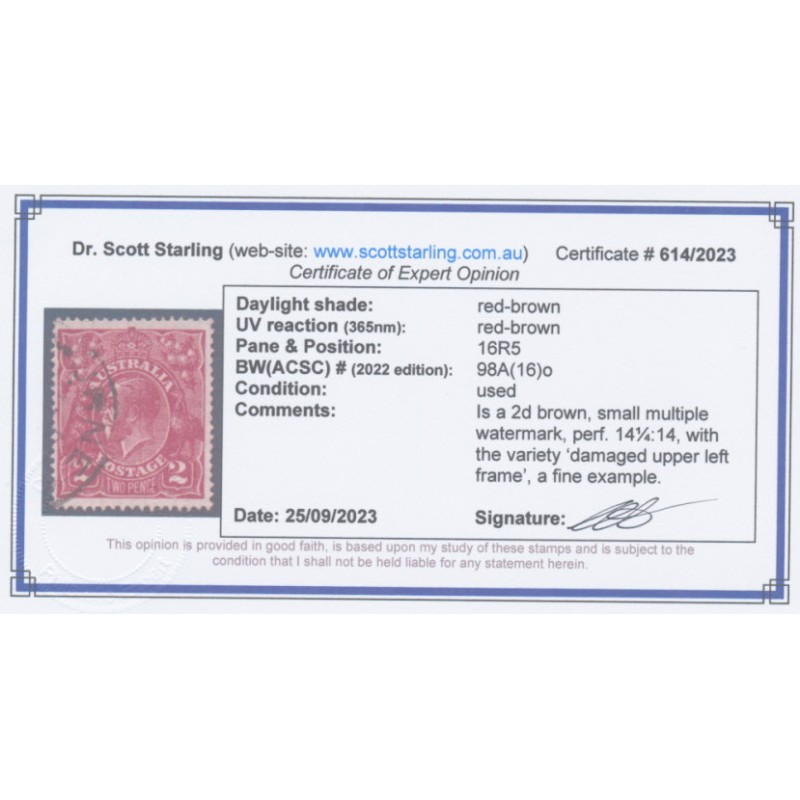 1928 2d red-brown KGV Head, small multiple watermark, perf. 14¼:14, has the variety ‘damaged upper left frame’ [position = 16R5], used – no thins, tears or bends. Has a Staling certificate.