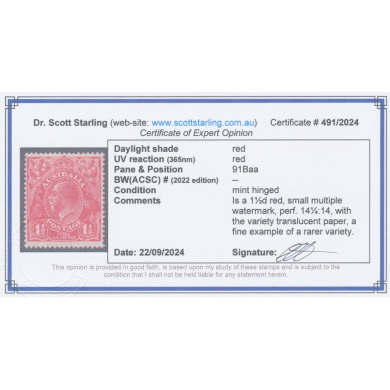 AUSTRALIA - 1926 1½d red KGV, SM watermark, p.14¼:14, 'translucent paper', MH – ACSC # 91Baa