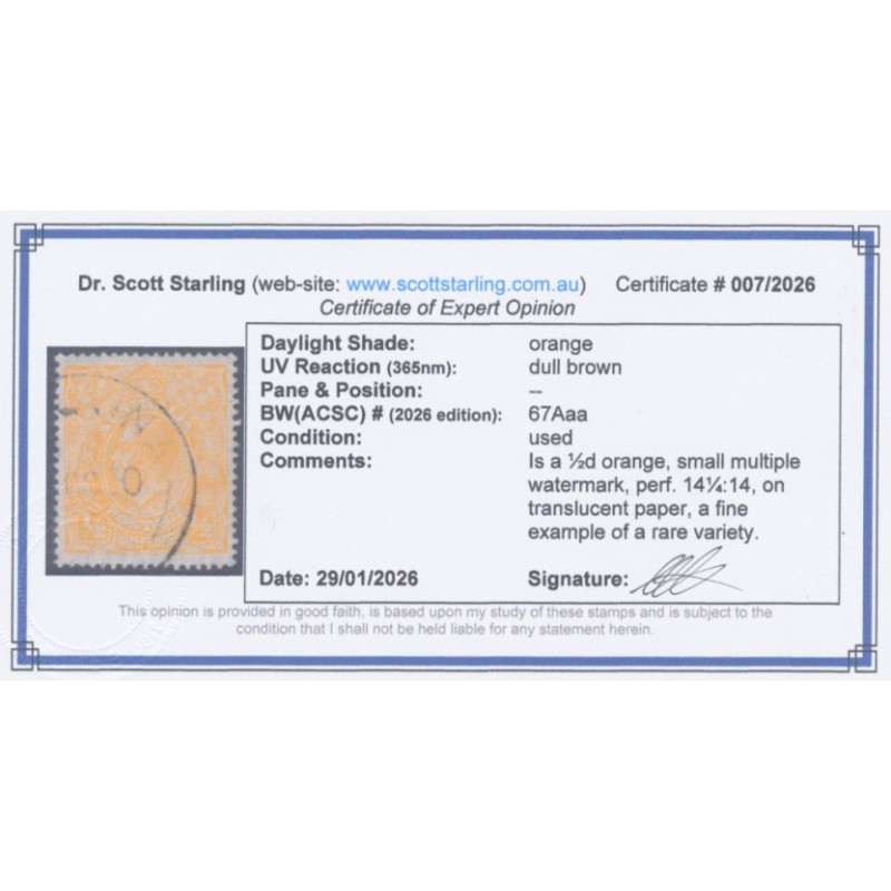 1927 ½d orange KGV Head, small multiple watermark, perf. 14¼:14, on translucent paper, used – no thins, tears or bends. Has a Starling certificate.