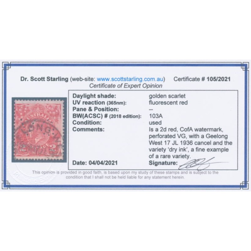 1931 2d golden scarlet KGV Head, CofA watermark, perforated VG, with the variety ‘dry ink’, used – no thins, tears or bends. Has a Starling certificate.