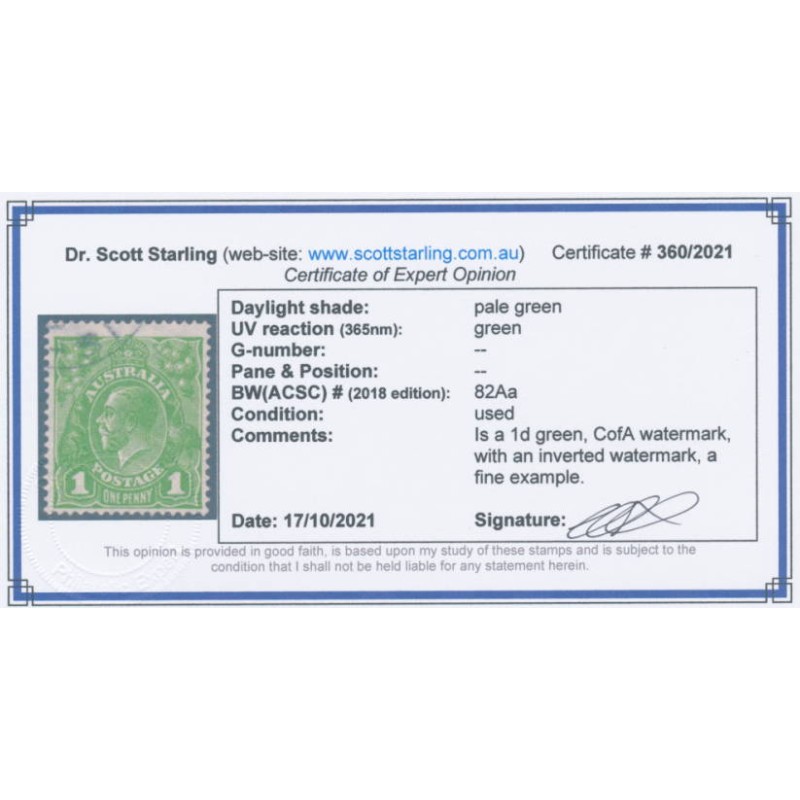 1931 1d pale green KGV Head, CofA watermark, with an inverted watermark, used – no thins, tears or bends. Has a Starling certificate.
