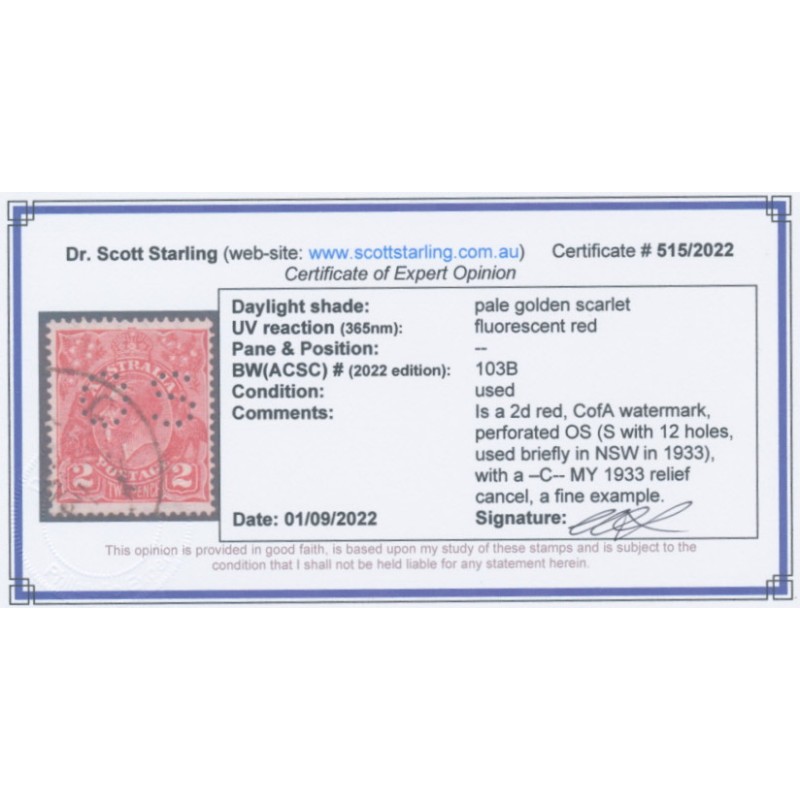 1933 2d pale golden scarlet KGV Head, CofA watermark, perforated OS (S with 12 holes), used – has a cut-down relief cancel --C-- MY 1933, NSW cancel, no thins, tears or bends. Has a Starling certificate. This OS perfin with 12 holes in the S was used for a few months in 1933 in New South Wales.