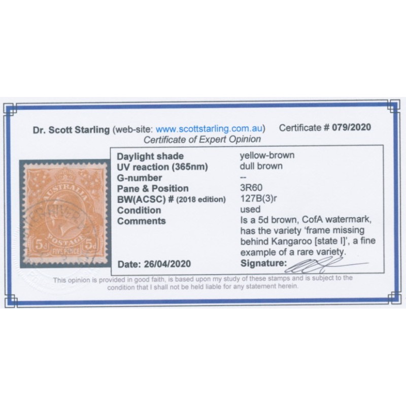 1932 5d yellow-brown KGV Head, CofA watermark, with the variety ‘missing frame behind Kangaroo [state I]’ [plate position = 3R60], used – no thins, tears or bends. Has a Starling certificate.