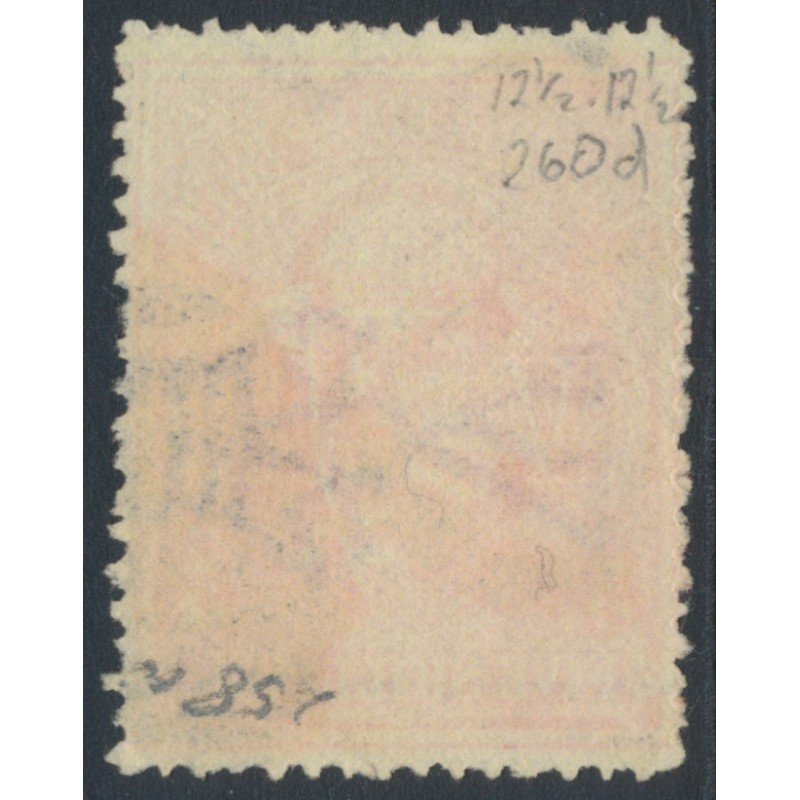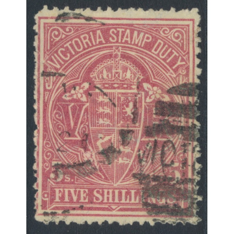AUSTRALIA / VICTORIA 1887 5/- reddish purple on lemon Stamp Duty, perf. 12½:12½, V crown watermark (SG type W19), used – no thins, tears or bends. SG Cat. # 260d