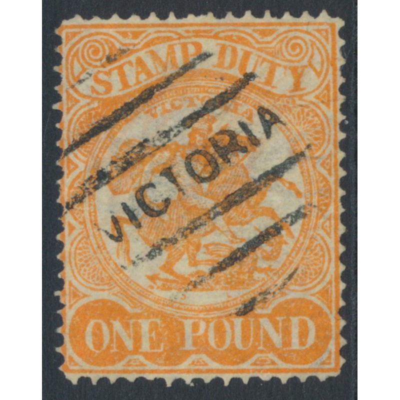 AUSTRALIA / VICTORIA 1884 £1 orange on yellow Stamp Duty, perf. 12½:12½, V crown watermark (SG type W19), used – no thins, tears or bends. SG Cat. # 262a