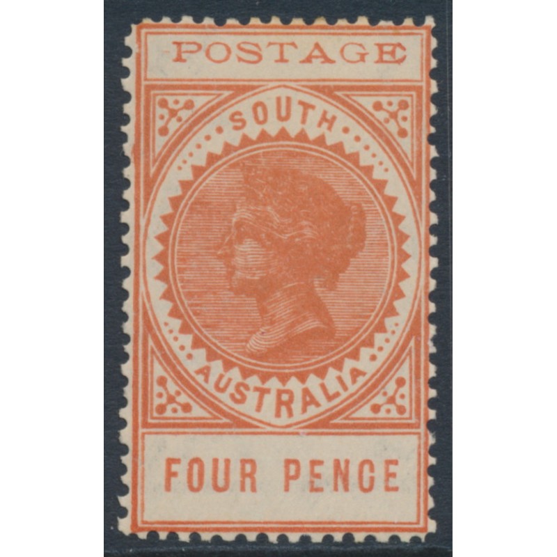1904 4d orange-brown Queen Victoria ‘Long Tom’, thin POSTAGE, perf. 12:12, crown SA watermark, inscription = 18mm long (Detmold), mint hinged – no thins, tears or bends.