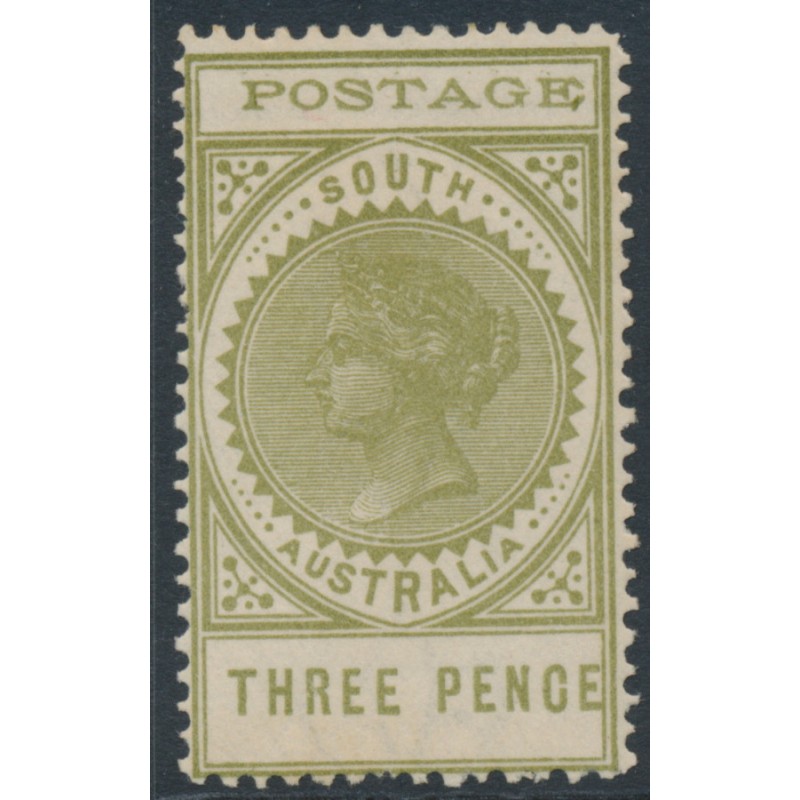 1904 3d deep olive-green Queen Victoria ‘Long Tom’, thin POSTAGE, perf. 12:12, crown SA watermark, inscription = 20mm long (Detmold), mint hinged – has a pulled perforation at the base.