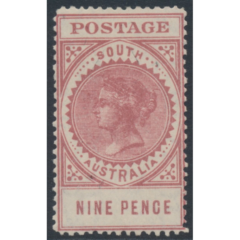 1906 9d dull brownish lake Queen Victoria ‘Long Tom’, thick POSTAGE, perf. 12:12, crown SA watermark, inscription = 16½mm long (NINE PENCE 1½mm apart), mint hinged – no thins, tears or bends.