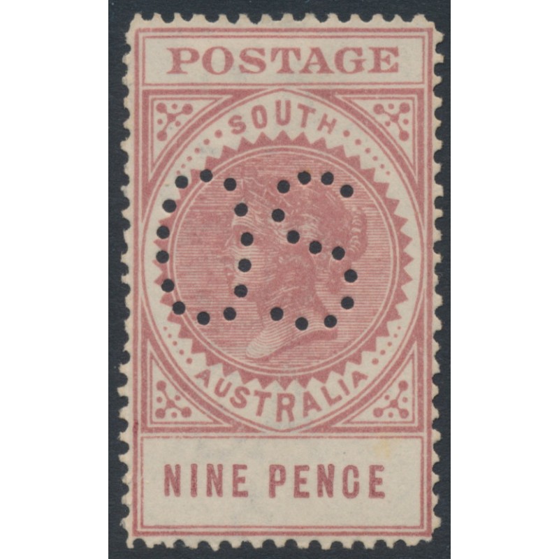 1906 9d dull brownish lake Queen Victoria ‘Long Tom’, thick POSTAGE, perf. 12:12, crown SA watermark, inscription = 16½mm long (NINE PENCE 1½mm apart), perforated OS, mint hinged – no thins, tears or bends.