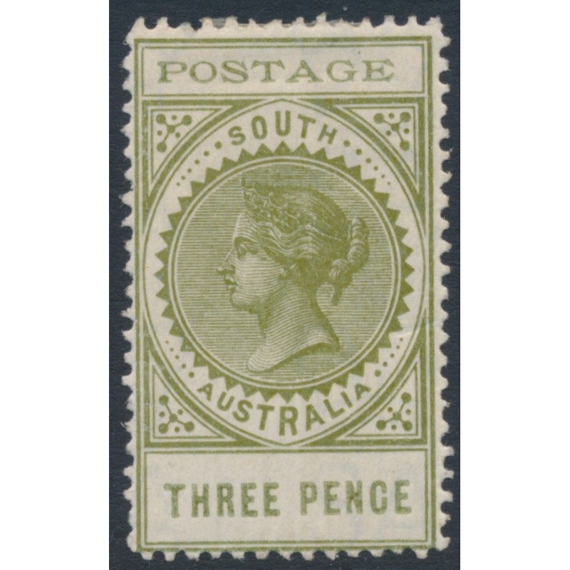 1902 3d olive-green Queen Victoria ‘Long Tom’, thin POSTAGE, perf. 12:11½, crown SA watermark, inscription = 18½mm long (De La Rue), mint hinged – no thins, tears or bends.