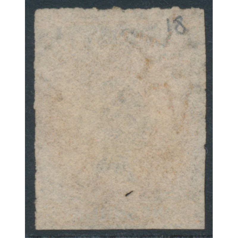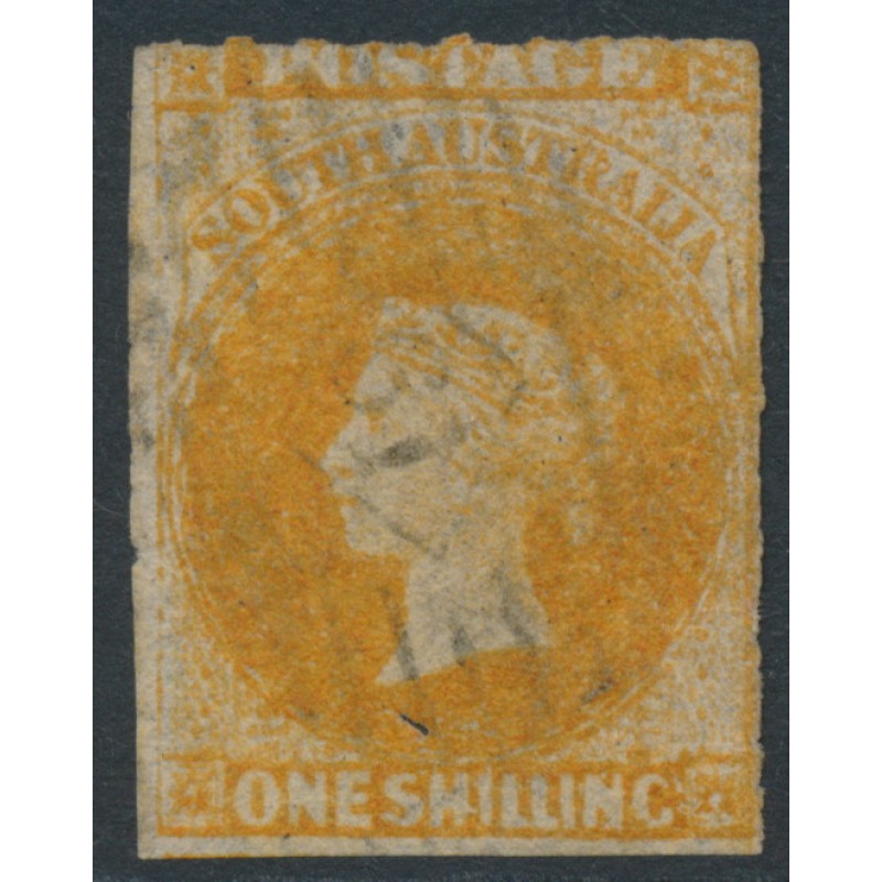 1859 1/- orange Queen Victoria Diadem, rouletted, large star watermark, used – has a ‘61’ in diamond numeral cancel (= Mount Gambier), no thins, tears or bends.
