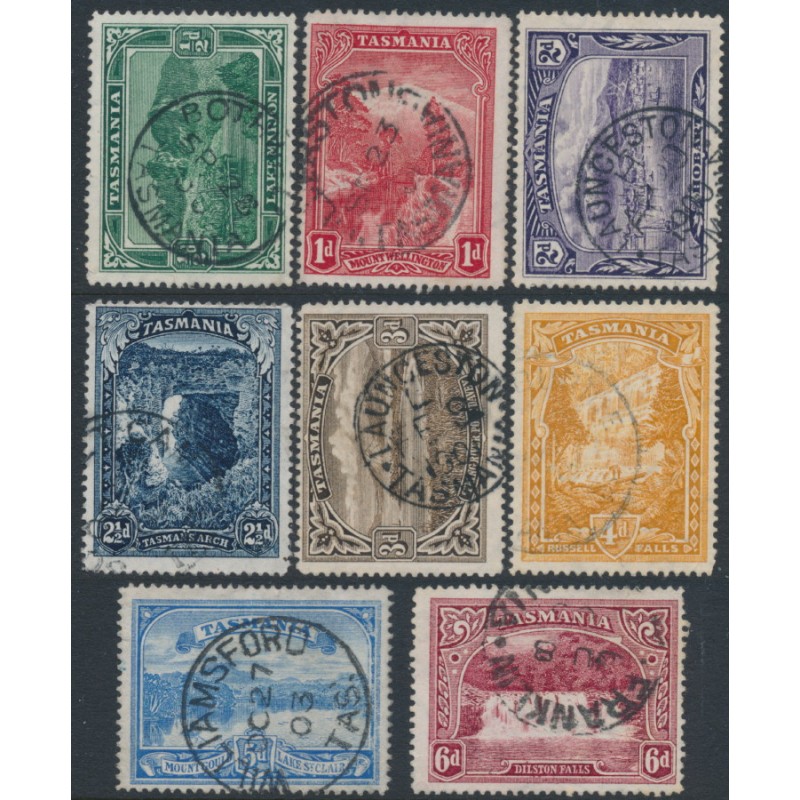 AUSTRALIA / TASMANIA 1899-1900 ½d to 6d Pictorials set of 8, TAS watermark, used – no thins, tears or bends. SG Cat. # 229-236