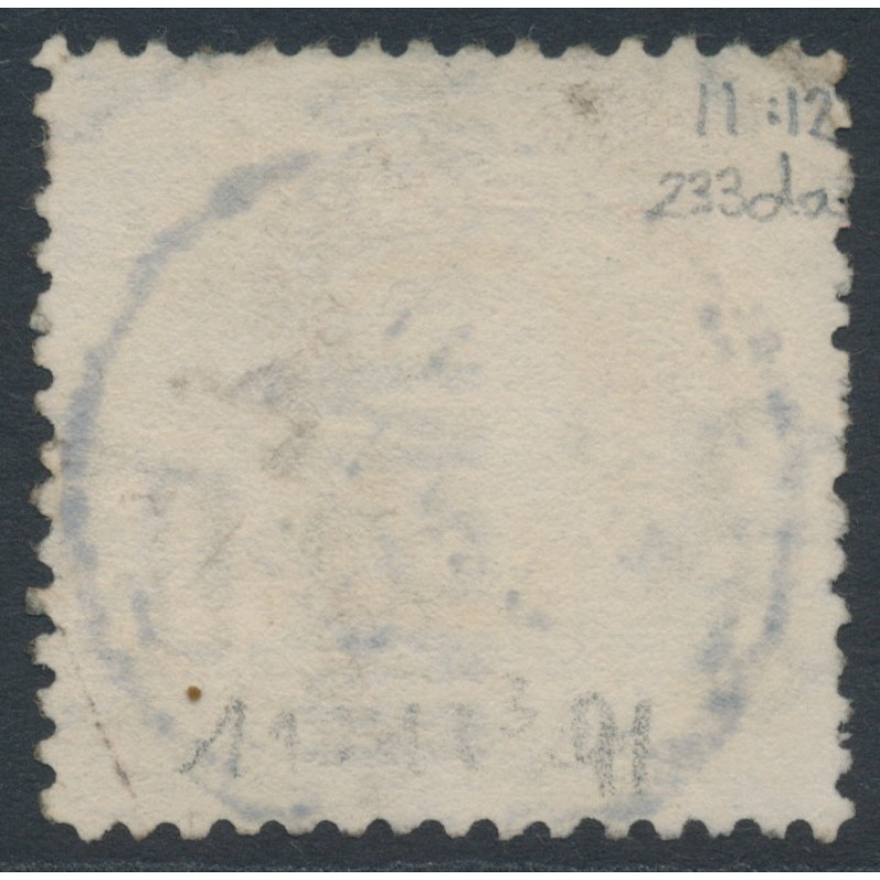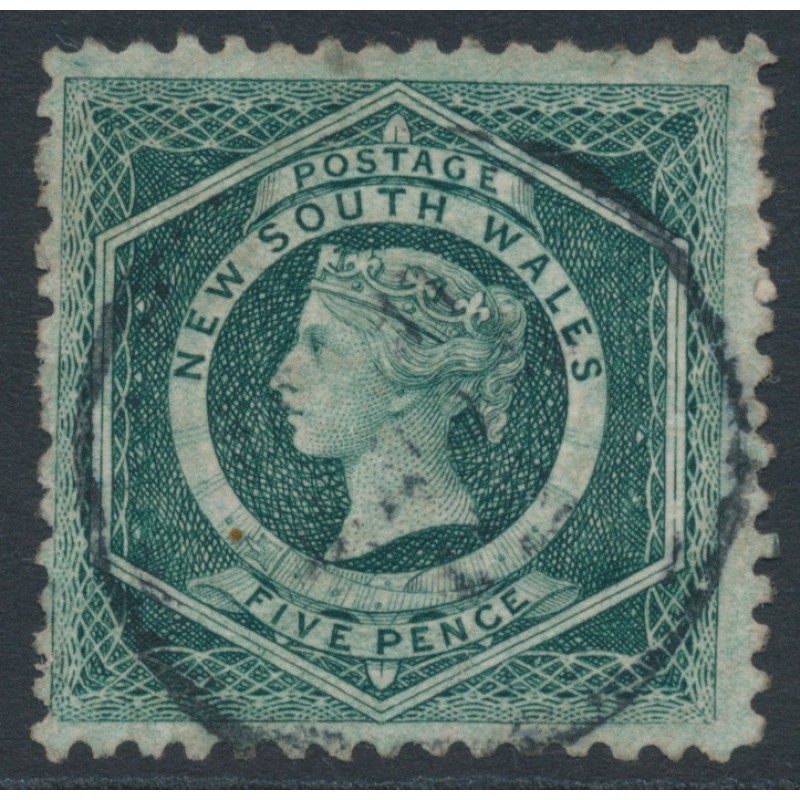 1885 5d blue-green Queen Victoria Diadem, perf. 11:12, sideways crown NSW watermark (SG type = W40), used – no thins, tears or bends.