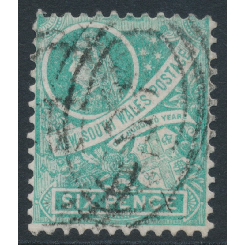 AUSTRALIA / NEW SOUTH WALES / N.S.W. 1898 6d emerald-green Queen Victoria & Colony Arms, perf. 12:12, crown NSW watermark, used – no thins, tears or bends. SG Cat. # 297fb
