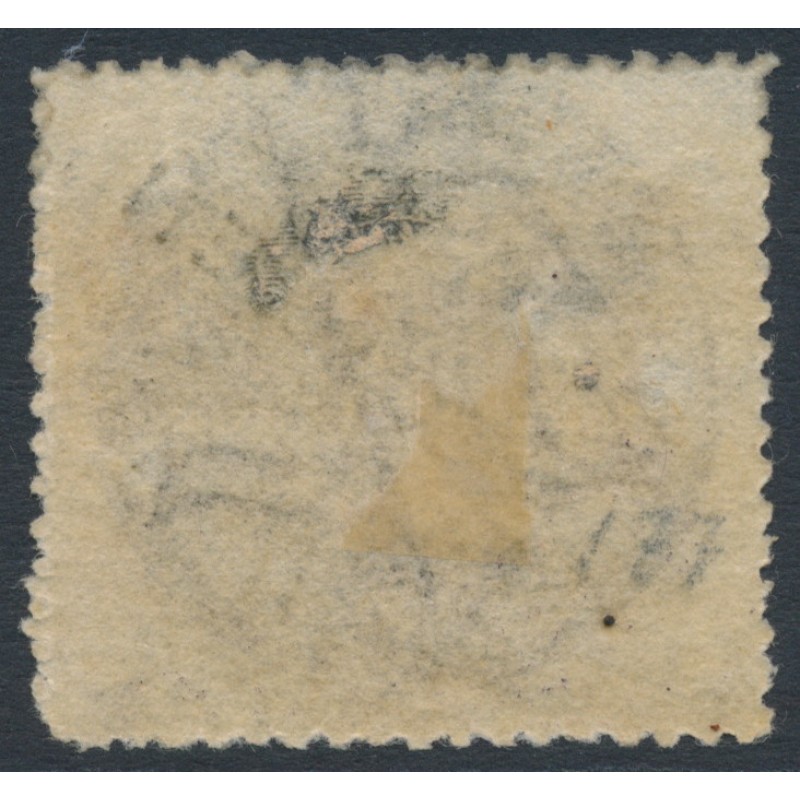 1870 5/- dull violet Coin, perf. 13:13, ‘5/~’ watermark, overprinted SPECIMEN, mint hinged – has a slightly rounded corner, otherwise sound. Specimen stamps of this era were sold stuck to a special sheet, usually by the top ¼ of the stamp. Consequently, the gum is usually missing at the top, generally a mess and has some of the residual paper stuck to the back.