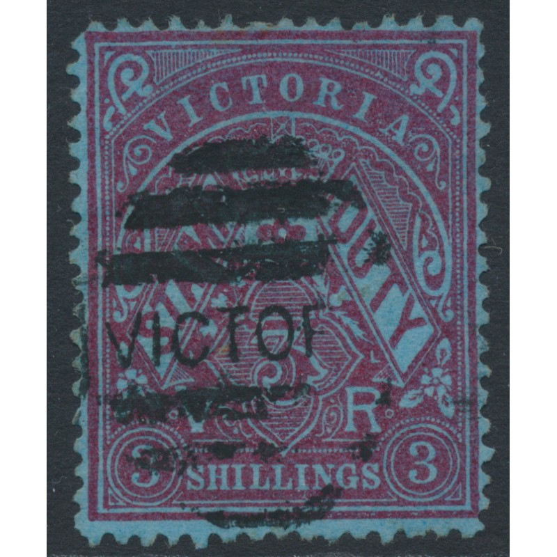 AUSTRALIA / VICTORIA 1884 3/- maroon on blue Stamp Duty, perf. 12½:12½, V crown watermark (SG type = W19), postally used – no thins, tears or bends. SG Cat. # 259
