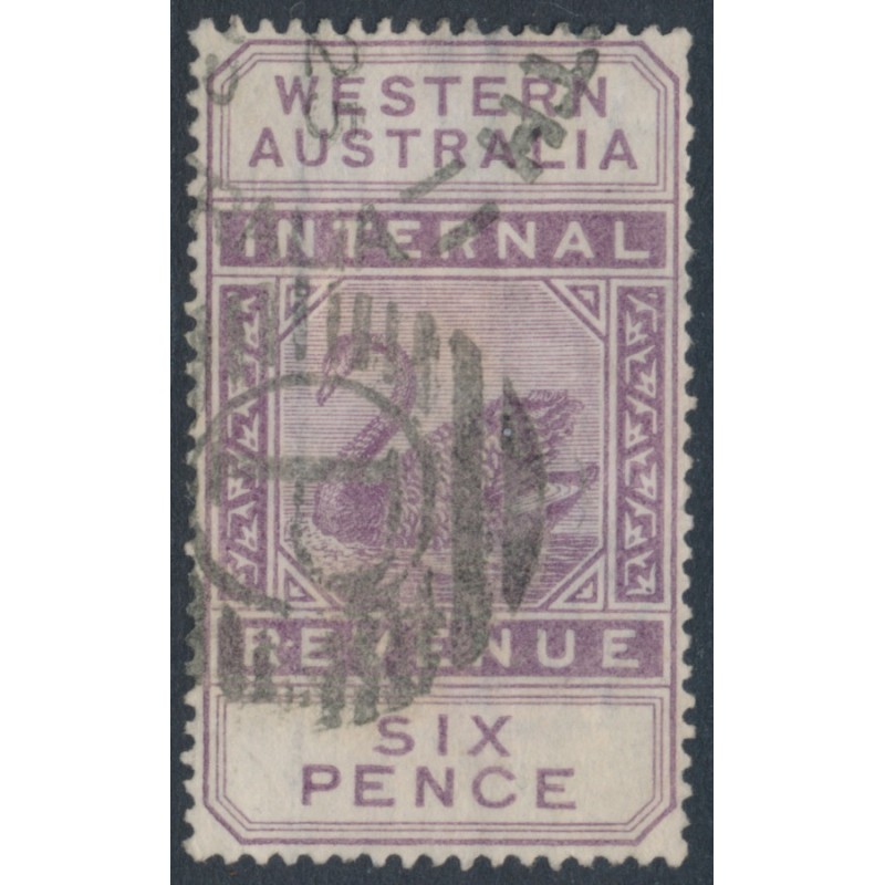 AUSTRALIA / WESTERN AUSTRALIA / W.A. 1893 6d dull purple Swan Internal Revenue, crown CA watermark, used – no thins, tears or bends. SG Cat. # F14