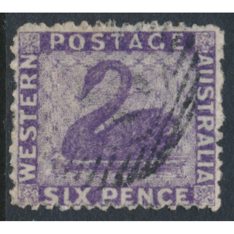 AUSTRALIA / WESTERN AUSTRALIA / W.A. 1864 6d deep lilac Swan, no watermark, perf. 13:13, used – no thins, tears or bends. SG Cat. # 51a