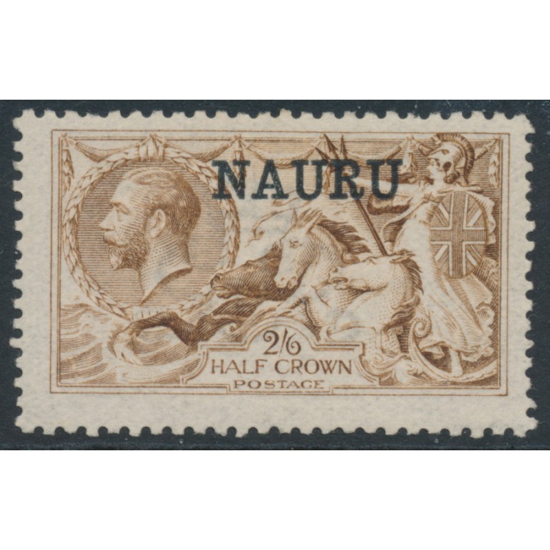 NAURU 1916 2/6 yellow-brown Great Britain Seahorses (picture is 22mm high – De La Rue printing) overprinted NAURU, mint hinged – no thins, tears or bends. SG Cat. # 20