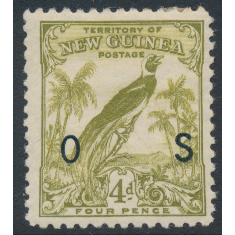 NEW GUINEA 1932 4d olive-green Bird of Paradise, no dates, overprinted OS, mint hinged – no thins, tears or bends. SG Cat. # O48