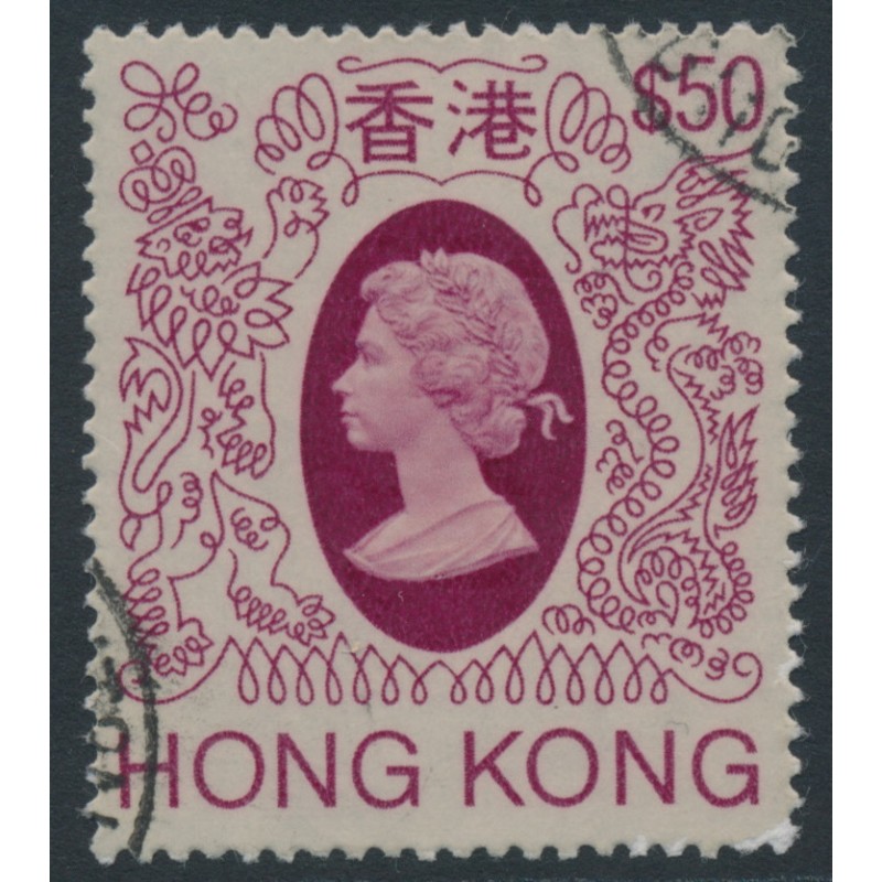 HONG KONG / 香港 1982 $50 deep claret/brownish grey QEII definitive, diagonal crown CA watermark, used – no thins, tears or bends. SG Cat. # 430