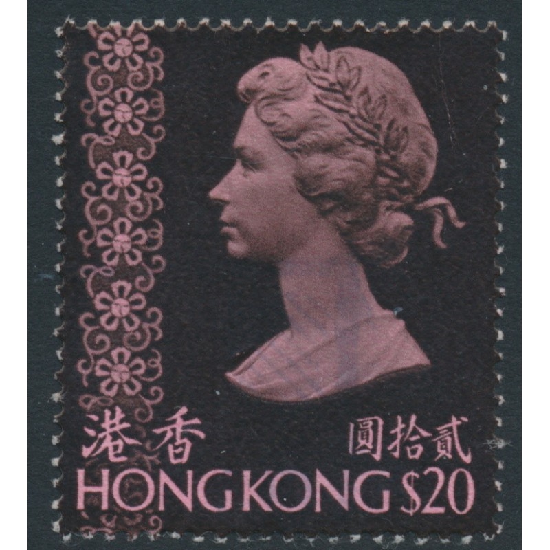 HONG KONG / 香港 1973 $20 pink/brownish black Queen Elizabeth II, crown CA watermark (SG type = W12), used – no thins, tears or bends. SG Cat. # 296