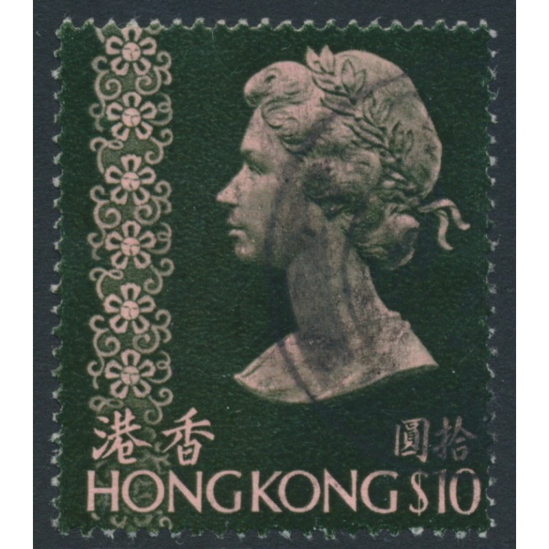 HONG KONG / 香港 1978 $10 pink/deep blackish olive Queen Elizabeth II, crown CA watermark (SG type = W14), used – no thins, tears or bends. SG Cat. # 324d