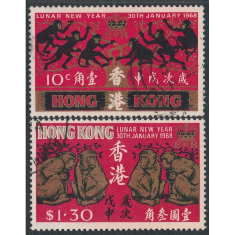 HONG KONG / 香港 1968 10c & $1.30 Chinese New Year (Monkey) set of 2, used – no thins, tears or bends. SG Cat. # 245-246
