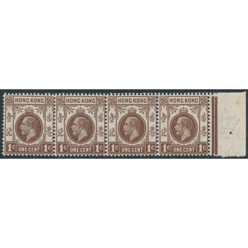 HONG KONG / 香港 1912 1c brown King George V definitive, multi crown CA watermark, horizontal strip of 4, mint never hinged – no thins, tears or bends. SG Cat. # 100
