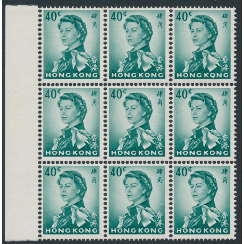 HONG KONG / 香港 1972 40c deep bluish green QEII Annigoni, sideways watermark, glazed paper, block of 9, mint never hinged – no thins, tears or bends. SG Cat. # 225a