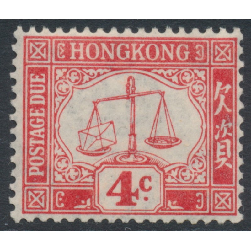 HONG KONG / 香港 1923 4c scarlet Post Office Scales postage due, upright multi crown CA watermark, mint hinged – no thins, tears or bends. SG Cat. # D3