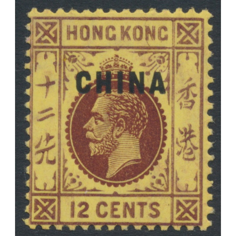 HONG KONG - 1917 12c purple on yellow KGV, o/p CHINA, MH – SG # 7