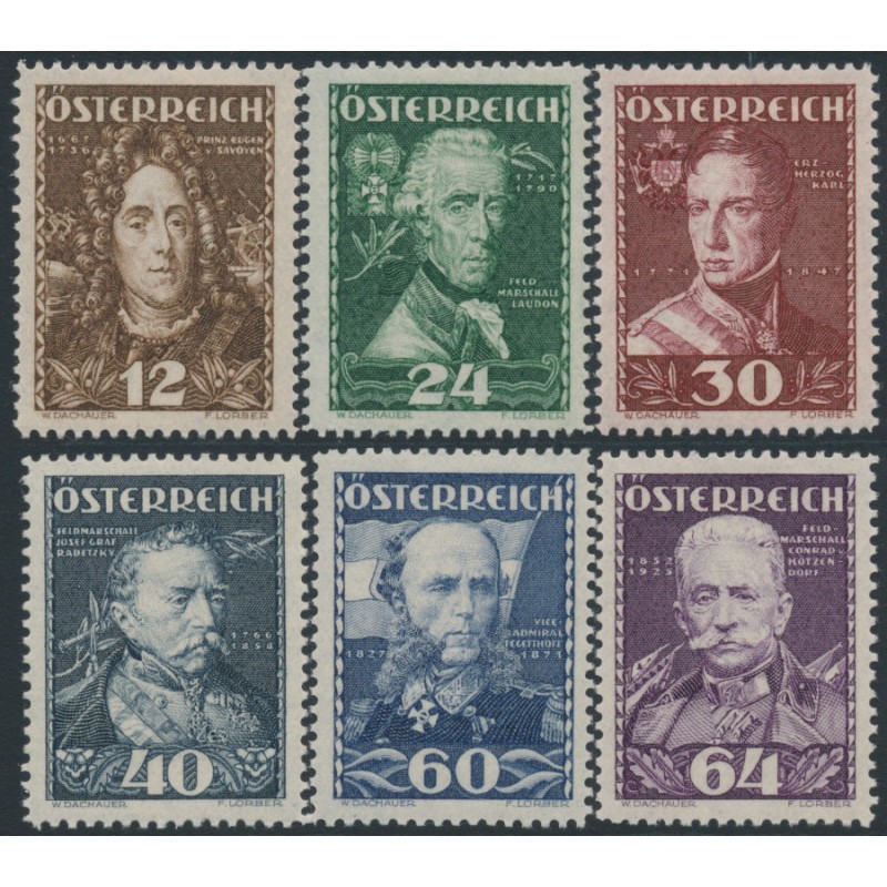 AUSTRIA / ÖSTERREICH 1935 12g+12g to 64g+64g Army Commanders set of 6, mint hinged – no thins, tears or bends. Michel Cat. # 617-622