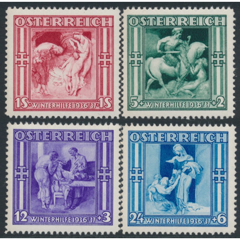 AUSTRIA / ÖSTERREICH 1936 5g+2g to 1S+1S Winter Relief set of 4, mint never hinged – no thins, tears or bends. Michel Cat. # 628-631