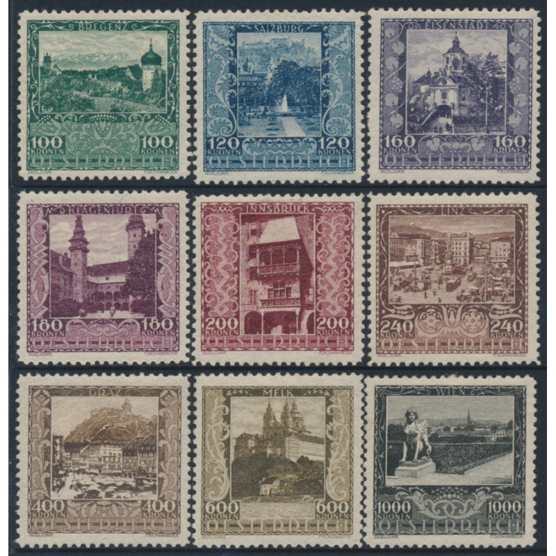 AUSTRIA / ÖSTERREICH 1923 Regional Capitals set of 9, mint hinged – no thins, tears or bends. Michel Cat. # 433-441