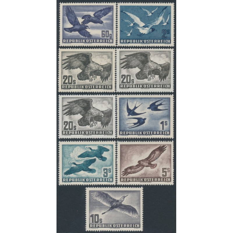 1950-1953 60g to 20S Birds Airmail definitives set of 7, includes the three different gum/paper types of the 20S value, mint never hinged – no thins, tears or bends.