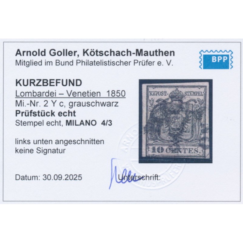 1854 10c grey-black Coat of Arms, imperforate on machine-made paper, used – no thins, tears or bends. Has a Goller BPP photo-certificate.