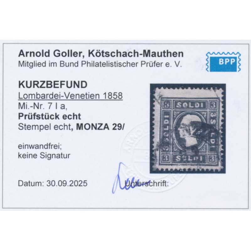 1858 3So black Emperor Franz Joseph, type I, used – has a MONZA, Italy cancel, no thins, tears or bends. Has a Goller BPP photo-certificate.