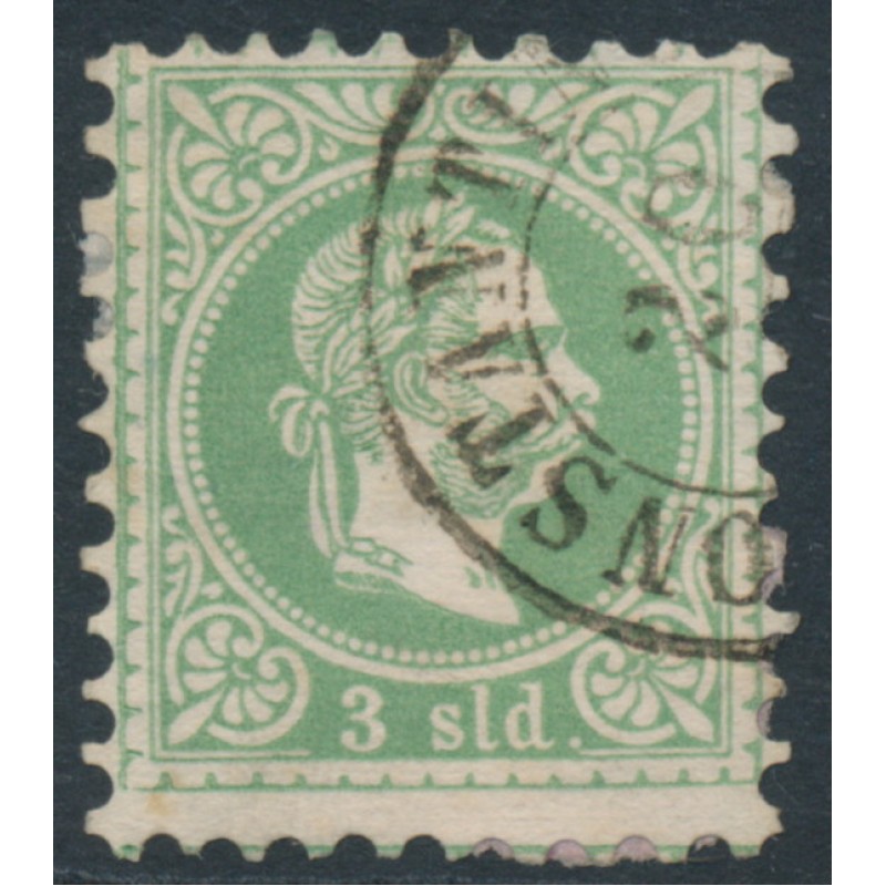 1867 3So green Emperor Franz Joseph, coarse print, used – has a CONSTANTINOPEL (= Constantinople, Turkey / Levant) cancel, no thins, tears or bends.