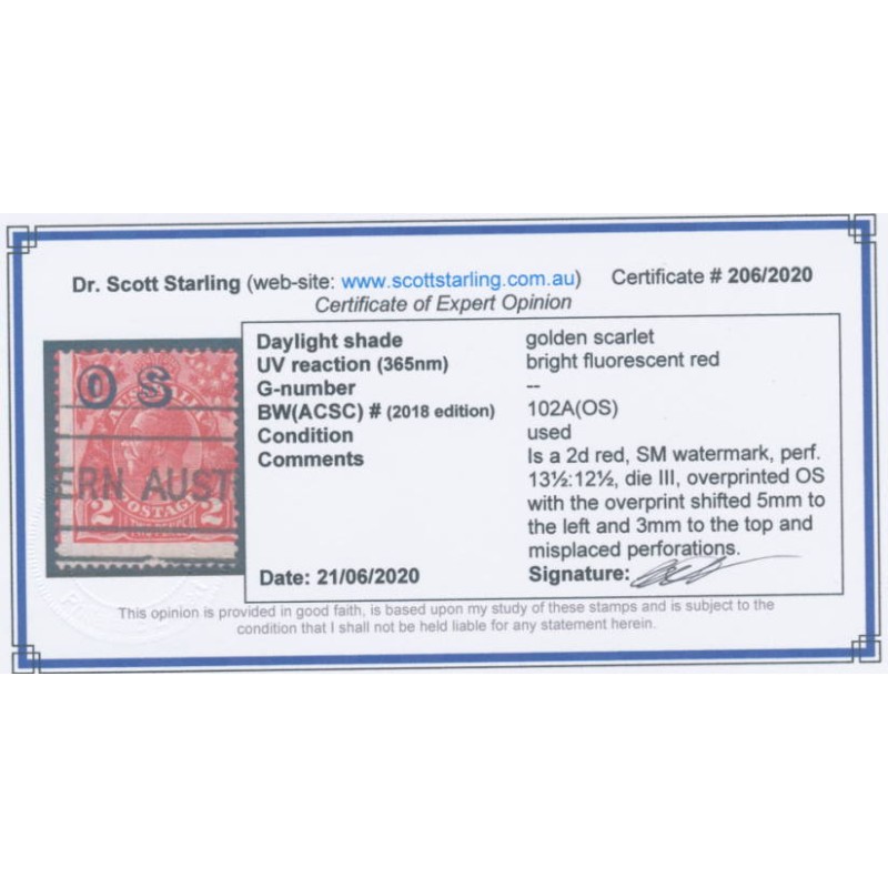 1932 2d golden scarlet KGV Head, small multiple watermark, perf. 13½:12½, overprinted OS, with a misplaced overprint and misplaced perforations, used – no thins, tears or bends. Has a Starling certificate.