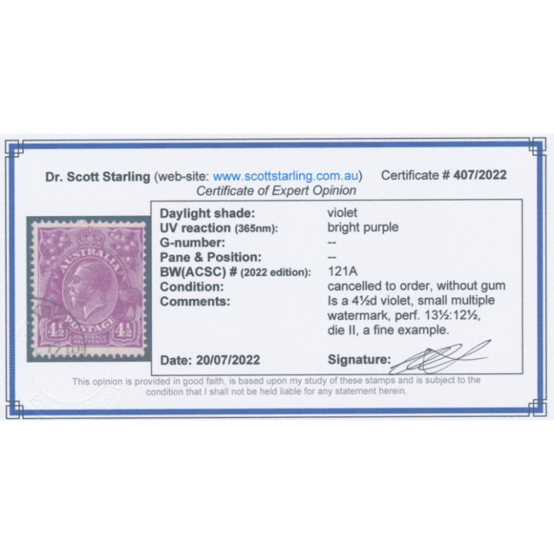 1930 4½d violet KGV Head, die II, small multiple watermark, perf. 13½:12½, cancelled to order – without gum, no thins, tears or bends. Has a Starling certificate.