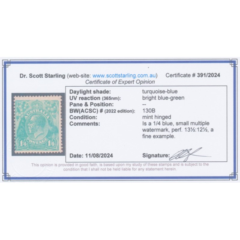 1928 1/4 turquoise-blue KGV Head, small multiple watermark, perf. 13½:12½, mint hinged – no thins, tears or bends. Has a Starling certificate.