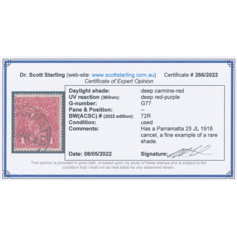 AUSTRALIA 1918 1d deep carmine-red (maroon) KGV Head (shade = G77), used – no thins, tears or bends. Has a Starling certificate. BW(ACSC) Cat. # 72R