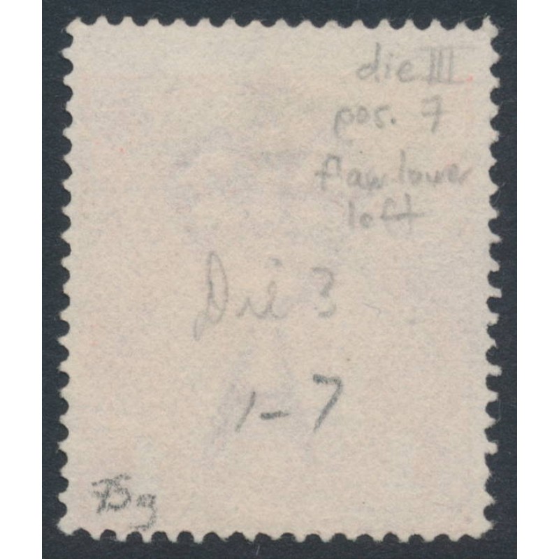1918 1d pale carmine-red KGV Head (die III, shade = G109), with the variety ‘white flaw in lower frame’ [position = 7], used – no thins, tears or bends. Has a Starling certificate.