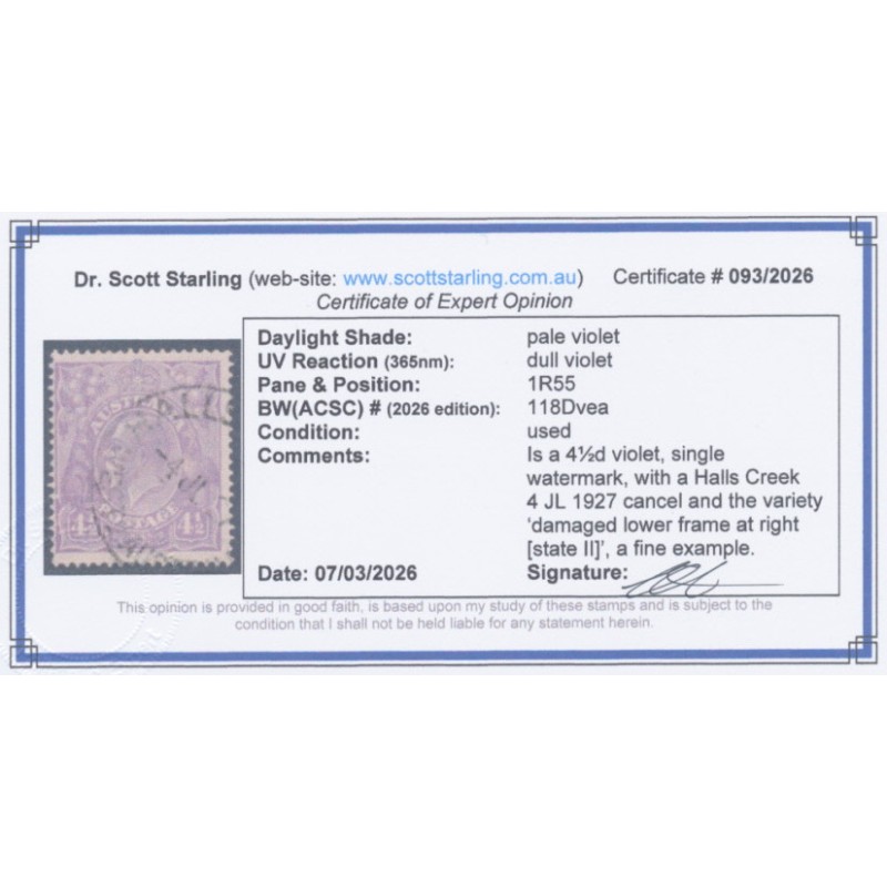 AUSTRALIA - 1924 4½d violet KGV, 'damaged lower frame [state II]' [1R55], used – ACSC # 118Dvea