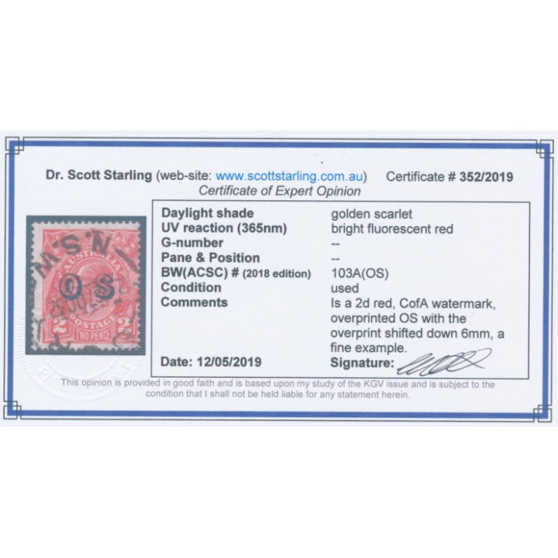 1932 2d golden scarlet KGV Head, CofA watermark, overprinted OS, with a misplaced overprint, used – no thins, tears or bends. Has a Starling certificate.
