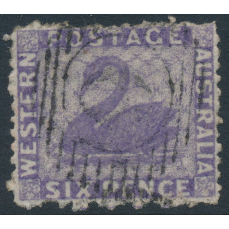 AUSTRALIA / WESTERN AUSTRALIA / W.A. 1864 6d deep lilac Swan, perf. 13:13, no watermark, used – no thins, tears or bends. SG Cat. # 51