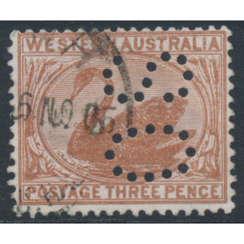 AUSTRALIA / WESTERN AUSTRALIA / W.A. 1893 3d red-brown Swan, sideways crown CA watermark, perforated OS, used – no thins, tears or bends. SG Cat. # 87