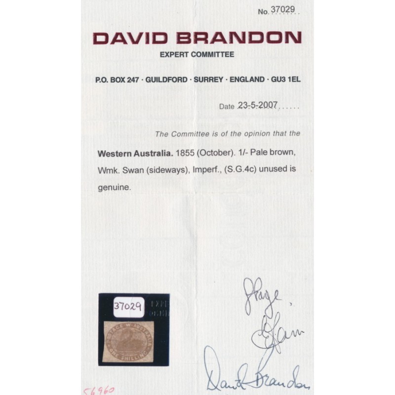 1855 1/- pale brown Swan, imperforate with swan watermark, unused – without gum, no thins, tears or bends. Has a Brandon photo-certificate.